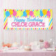 Super mignon ballons de couleur pastel et rayures pour cette unique Bannière d'Anniversaire Joyeux pour votre petite fille. Cette grande bannière est réutilisable année après année pour de nombreuses fêtes d'anniversaire à venir.
