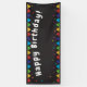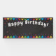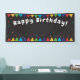 Banderole d'anniversaire joyeuse pour toile de fond photo ou fête d'anniversaire virtuelle. Des colonnes triangulaires aux couleurs vives, en haut et en bas, ainsi que des confettis et des étoiles éparpillés autour du texte sur un arrière - plan noir, font une déclaration festive.