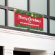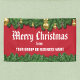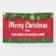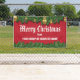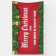 Bannière Joyeux Noël avec fond rouge et verdure avec bordures d'ornements dorés en haut et en bas. Personnalisez avec le nom de votre groupe ou entreprise pour un accueil extérieur ou une bannière de défilé.