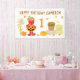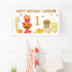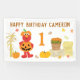 Rendez l'anniversaire de votre petit bout encore plus spécial avec cette bannière festive sur le thème de l'automne, mettant en vedette Elmo habillé d'un adorable costume de citrouille de jack-o'-lantern. La scène colorée comprend des citrouilles, des bottes de foin, des tiges de maïs et un seau en bois rempli de fleurs orange, le tout sur un fond blanc propre saupoudré de feuilles d'automne qui tombent. Un texte en gras en haut indique « Joyeux Anniversaire » avec un nom et un âge personnalisables, ce qui en fait le décor idéal pour une première fête d'anniversaire cosy sur le thème de l'automne.