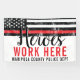 Cette mince ligne rouge Heroes Work Here sign est parfait pour montrer votre reconnaissance pour les pompiers et les premiers intervenants qui aident à garder votre communauté en sécurité. Le panneau est personnalisable avec le nom de votre ville ou comté. L'arrière - plan du drapeau américain et l'insigne de la police ajoutent un peu de flair !