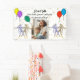 Célébrez votre enfant le premier anniversaire avec son signe zodiaque. Les Gemini sont violets, bleus et les couleurs automnales dorés motif doré doré. Ballons colorés bleu, rouge, jaune, vert et violet décorent la bannière. Les confettis d'or sont exposés au hasard sur la bannière blanche de l'arrière - plan. Customisez avec votre photo et votre nom.