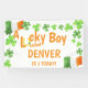 Bannière de fête d'anniversaire Lucky Boy, personnalisée avec son nom et son âge. "Un Lucky Boy appelé [nom] est [âge] aujourd'hui" est écrit en orange de typographie lunaire avec un fer à cheval d'or chanceux. Le design est complet avec du shamrock vert, quatre feuilles de trèfle et le drapeau irlandais.