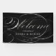 Bannière de bienvenue mariage avec texte de script FAUX argenté fantaisie. Le mot "bienvenue" est une IMAGE produite pour avoir l'air d'avoir une finition métallique grise, mais il est imprimé à l'encre plate et ne peut pas être édité. Tous les autres textes peuvent être entièrement modifiés. Choisissez votre taille et customisez le texte, ou cliquez sur "Customiser plus loin" pour modifier la couleur et la taille ou le style de police arrière - plans.