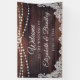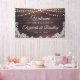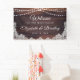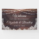 Bienvenue les invités à un mariage (ou autre événement mariage comme la réception, douche nuptiale, douche à couple, etc. puisque tout le texte est modifiable ) avec cette bannière avec bois rustique, lampes à cordes et dentelle blanche pour un mariage de campagne, grange, vintage ou extérieur. Contactez le concepteur via Zazzle Conversation ou makeitaboutyoustore@gmail.com si vous souhaitez modifier ce design, sur un autre produit ou des éléments de coordination.