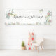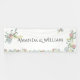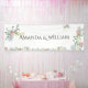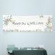 Cette bannière de mariage exquise est ornée d'un motif floral élégant comprenant de délicates roses et hydrangeas nichées parmi des feuilles vertes luxuriantes. Les noms des conjoints sont imprimés à l'aide d'une police de caractères serif classique qui améliore encore l'élégance générale.