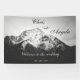 Mariage noir et blanc sous les montagnes. Photo de paysage d'une montagne enneigée avec l'obscurité en dessous et le ciel nuageux blanc au-dessus. Les noms du couple sont en caractères noirs au-dessus de la montagne dans le ciel et tous les détails sont en caractères blancs au-dessous de la montagne. Produits mariages entièrement personnalisables et personnalisables.