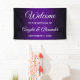Une calligraphie blanche moderne et élégante, avec une police de style tout casquette moderne, affiche un message de bienvenue mariage. Vous pouvez changer la couleur violet foncé derrière le graphisme de groupe noir ombre. Utilisez une nuance de marron, ou une autre couleur, qui correspond à votre palette de mariages. Signe mariage noir et violet violet foncé.
