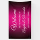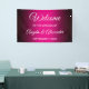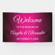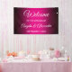 Une calligraphie blanche moderne et élégante, avec une police de style tout casquette moderne, affiche un message de bienvenue mariage. Vous pouvez changer la couleur rose-chaud foncé derrière le graphisme de groupe à l'ombre noire. Utilisez une nuance de marron, ou une autre couleur, qui correspond à votre palette de mariages. Noir, vin foncé, et chaud rose sombre signe mariage.
