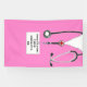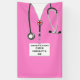 Doctor graduation congrats design featuring pink hospital scrubs for medical school grad event or celebration party. To personalize edit text to add physician's name and medical credentials.
