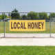 La bannière locale de signe de miel pour que des vendeurs ou des apiculteurs de miel obtiennent l'attention à votre cabine de bord de la route, agriculteurs lancent la cabine, ou l'entrée sur le marché de ferme. Type Brown sur un arrière - plan d'or jaune.