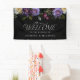 Élégante bannière de bienvenue à la mariage floraison avec une bordure supérieure de fleurs d'ivoire, de violet et de bordeaux avec feuillage vert luxuriant et baies foncées. La bannière d'accueil à fleurs violettes est complétée par une typographie moderne. Personnalisez la bannière gothique à mariages floraux avec vos noms. Conçu pour coordonner avec notre collection Moody Gothic Floral mariage.