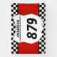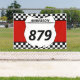Tailgate en style lors de votre prochaine course de motocross avec bannière personnalisée. Cette bannière a une plaque blanche qui est prête à être personnalisée avec votre nom et numéro de vélo. La plaque numérique est fixée contre un arrière - plan rouge avec une bordure de drapeau à damiers noir et blanc.
