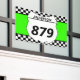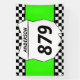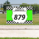 Tailgate en style lors de votre prochaine course de motocross avec bannière personnalisée. Cette bannière a une plaque blanche qui est prête à être personnalisée avec votre nom et numéro de vélo. La plaque numérique est fixée contre un arrière - plan vert vif avec une bordure de drapeau à damiers noir et blanc.