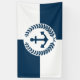 Nautical themed design with anchor and laurel wreath decoration over blue and white geometric background