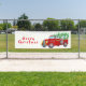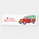 Cette bannière de Noël est montrée dans le style extérieur avec des grommets. Choisissez à l'intérieur ou à l'extérieur, avec ou sans grommets. Montré dans un arrière - plan blanc avec une image du vieux camion de campagne rouge portant un arbre de Noël à l'arrière. Joyeux salut de Noël. Personnaliser ou achat tel que conçu