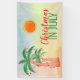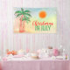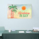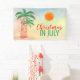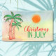 Fêtons Noël en juillet avec une fête ! Famille Invitation et amis à votre fête de Noël et décorez-la avec cette bannière de style île avec des palmiers dessinés à la main et décorés de lumières sur un arrière - plan d'aquarelle. Aquarelle originale © Michele Davies.