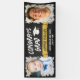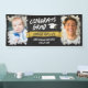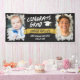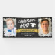 Célébrez votre diplômé avec cette bannière grad avec un arrière - plan de tableau noir et deux photos du diplômé, l'une de lui en tant que bébé et l'autre à son âge actuel. FÉLICITE GRAD dans une police en détresse et le nom de la bande sur une bannière jaune. Banderole de graduation cool personnalisée avec des photos de votre fils et son nom dans une police de cool en détresse.
