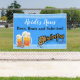 Bannière promotionnelle de la petite entreprise à thème Oktoberfest réalisée dans un motif en diamant bleu et blanc, avec une bande solide bleue audacieuse, à travers le milieu. Des graphiques de deux steins de bière en verre et un bretzel décorent le côté gauche, et des graphiques décoratifs de texte lisant Oktoberfest, décorent le côté inférieur droit. Le texte personnalisé blanc et noir est prêt à être personnalisé pour votre Oktoberfest ou entreprise européenne.