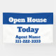 Cette bannière de l'immobilier à maison ouverte a un texte d'affichage dit "Open House Today" mais vous pouvez changer le libellé si nécessaire. En bas, il y a un endroit pour ajouter le nom et le numéro de téléphone de l'agent immobilier. La partie supérieure est bleue. Le reste de la bannière est blanc. Tout le texte peut être modifié ou supprimé.