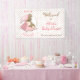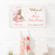Cette bannière est une excellente façon d'accueillir les invités arrivant à votre baby shower! Il est orné d'un adorable petit ours en peluche marron dormant, avec une casquette rayée rose et blanche et des couvertures roses. L'image est encadrée dans un cercle mince de lignes brunes, et placée contre un arrière - plan de polkadot rose et marron. Il y a un champ de texte personnalisé en rose foncé en haut et en bas, et vos informations sont en marron et rose correspondant à droite.