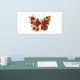 Papillon de fleurs aux yeux de paon rouge à aile texturée rouge, décoré de composition de roses rouges, artistiquement peints avec des tiges dorées et feuilles sur arrière - plan blanc.
