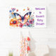 Un joli papillon entouré de fleurs roses et violettes aquarelle illustration baby shower fille bannière personnalisée.