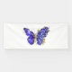 Bijoux, bleu, saphir, papillon aux fleurs pétillantes avec aile décorée de bleu, fleurs précieuses avec feuilles d'or sur arrière - plan blanc.