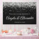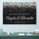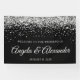 Art numérique de parties scintillant argenté contre le noir solide. Une calligraphie noire moderne et élégante, avec une police de style casquette moderne, affiche un message de bienvenue mariage. Customisez le style de police et les couleurs et créez votre propre bannière 4' x 6'.