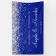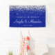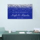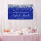 Art numérique de parties scintillant argenté contre une solide toile bleue royale. Une calligraphie noire moderne et élégante, avec une police de style casquette moderne, affiche un message de bienvenue mariage. Customisez le style de police et les couleurs et créez votre propre bannière.