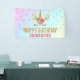 Éblouissez vos invités avec cette mignonne bannière de fête d'anniversaire à thème unicorne avec un beau visage de licorne de parties scintillant en faux or et de jolies fleurs avec la typographie de parties scintillant en faux or sur un arrière - plan pastel dégradé arc-en-ciel.
