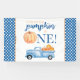Notre petite bannière de premier anniversaire citrouille avec citrouille aquarelle et plaid bleu et camion bleu.