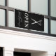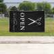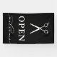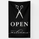 Bannière d'affaires ouverte verticale pour un salon de coiffure ou couturière avec une paire de ciseaux en blanc sur OUVERT écrit en lettres élégantes, et bienvenue dans un script tourbillonnant contre un arrière - plan noir. Une bannière d'affaires épurée et minimaliste ouverte pour un salon de coiffure, un salon de coiffure, un salon de coiffure ou autre. Bannière ouverte noire pour petite entreprise sans logo avec une paire de ciseaux.