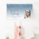 Bienvenue aux invités avec cette bannière photo chic et glamour de 21e anniversaire, avec une frise brillante bleue fausse parties scintillant et arrière - plan bleu ombre. Remplacez facilement l'exemple d'image par une photo de l'invité d'honneur. Personnalisez-le avec son nom en écriture manuscrite bleue, avec l'occasion et la date ci-dessous en police bleue sans serif.
