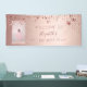 Une bannière pour une fête d'anniversaire girly et glamour du 16ème anniversaire (ou de n'importe quel âge). Un arrière - plan métallique à l'or rose faux avec un élégant or faux rose, cadre de parties scintillant rose et étoiles qui dégouline. Personnalisez et ajoutez votre propre photo de la fille d'anniversaire. Le texte : Bienvenue à, et le est le nom écrit en or rose foncé avec un grand script de style écrit main moderne.