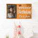 Affichez cette Bannière photo Spooktacular Halloween en l'honneur de la personne d'anniversaire. Personnalisez avec son nom, son âge et sa photo. Cette bannière éffrayante orange et noire présente une mignonne araignée suspendue à une toile d'araignée avec des polices de vacances déplaisantes.
