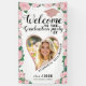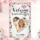 Créez une élégante bannière de bienvenue personnalisée pour la fête de remise des diplômes, conçue dans des couleurs rose vif et or rose, décorée de casquette de diplômé, une photo en forme de coeur dans un cadre doré rose et roses roses avec feuilles monstères sur un arrière - plan blanc. Ce design modèle permet de customiser facilement avec la photo personnalisée, le prénom et le nom de famille, l'année de l'événement et le nom de l'école.