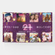 Bienvenue à une fête d'anniversaire de 21e (ou tout âge) pour une fille, célébrant sa vie avec un collage de 8 de vos propres photos. Photo de famille, amis, animaux de compagnie, vacances. Personnalisez et ajoutez un nom, 21 ans et une date. Avec le texte : Bienvenue (x2) Lettres blanches et roses. Arrière - plan élégant violet profond. La couleur arrière - plan violette est inégale. Décoré d'étoiles dorées.