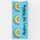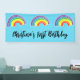 Nom du garçon ou de la fille d'anniversaire sur une bannière bleue avec des arcs-en-ciel fantaisistes.