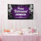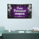 Fun banner sign for indoors or out, featuring festive silver metallic balloons on both sides of the design with sparkly, silver metallic confetti on a rich textured purple background for your personalized retirement party banner.