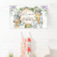 Bannière d'accueil sur le thème de la jungle adorable avec des fleurs violettes d'aquarelle et de mignons animaux safari. Personnalisez le libellé pour convenir à votre occasion, c'est-à-dire l'anniversaire, le baby shower, l'aspersion de bébé, le baptême, etc.