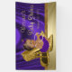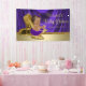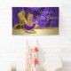 Bannière de baby shower violet et or avec adorable petite fille ethnique portant un joli tutu violet et un chapelet de perles assis sur une belle paire de chaussures de talon en or parties scintillant sur un riche arrière - plan violet et or. Vous pouvez personnaliser avec votre texte.