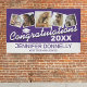 Banderole de fête aux couleurs de l'école supérieure personnalisée avec un arrière - plan violet qui peut être changée en n'importe quelle couleur, 5 photos de l'élève, une casquette de fin d'études, et un modèle de félicitations facile à personnaliser.