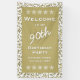 Accueil à ma quatre-vingt-dixième fête d'anniversaire.  Un grand or et une bannière blanche avec le texte blanc et les modèles pour la rendre facile pour vous de changer en vos propres mots, noms, et dates.  Vous pouvez personnaliser tout les texte utilisant les modèles fournis.    Le signe est équilibré avec des étoiles et des lignes de contre-taille.  Le cadre est un motif aléatoire de collage du numéro 90.  Un grand or et un thème blanc de fête d'anniversaire pour au-dessus - de la célébration de colline.