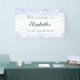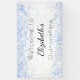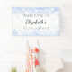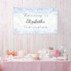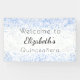 Une bannière de bienvenue pour une Quinceañera girly et glamour, 15e anniversaire fête. Un arrière - plan blanc décoré de poussière de parties scintillant bleu clair et bleu bébé. Personnalisez et ajoutez un nom et un âge. Lettres noires.