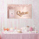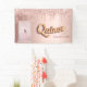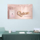 Une bannière pour une fête féminine et glamour Quinceañera. Un faux rose à l'apparence métallique d'or arrière - plan avec de l'or rose, des gouttes de parties scintillant rose, la peinture goutte à goutte. Ajoutez votre propre photo de la fille d'anniversaire et son nom. Le mot : coing avec une police de style ballon doré.