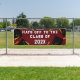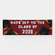 Bannière de félicitations pour la remise de diplômes de la promotion créative 26 avec des chapeaux de diplôme noirs et dorés sur fond bordeaux. Modifier le texte pour changer l'année de la promotion.
