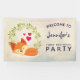 Bannière d'anniversaire avec un arrière - plan couleur crème grunge aux formes géométriques chic et tendance. En haut, un dessin animé représentant un mignon renard orange dormant tranquillement. Une couronne feuille verte avec 3 petits coeurs rouges derrière.