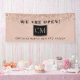 Sur un arrière - plan en or rose clair bordé d'une parties scintillant rose vif et brillant, voici les mots que vos clients ont voulu voir : "Nous sommes ouverts !." La pièce maîtresse de cette bannière horizontale est votre logo monogramme unique et votre nom commercial pour faciliter la reconnaissance de votre entreprise. Conçue pour les coiffeurs et les salons de maquillage, cette bannière pourrait être adaptée à n'importe quel magasin de détail. Tout le texte peut être facilement révisé sur le modèle de personnalisation.