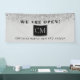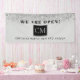 Sur un arrière - plan d'argent clair bordé d'une parties scintillant gris-argent scintillante sont les mots que vos clients ont voulu voir : "Nous sommes ouverts !." La pièce maîtresse de cette bannière horizontale est votre logo monogramme unique et votre nom commercial pour faciliter la reconnaissance de votre entreprise. Conçue pour les coiffeurs et les salons de maquillage, cette bannière pourrait être adaptée à n'importe quel magasin de détail. Tout le texte peut être facilement révisé sur le modèle de personnalisation.